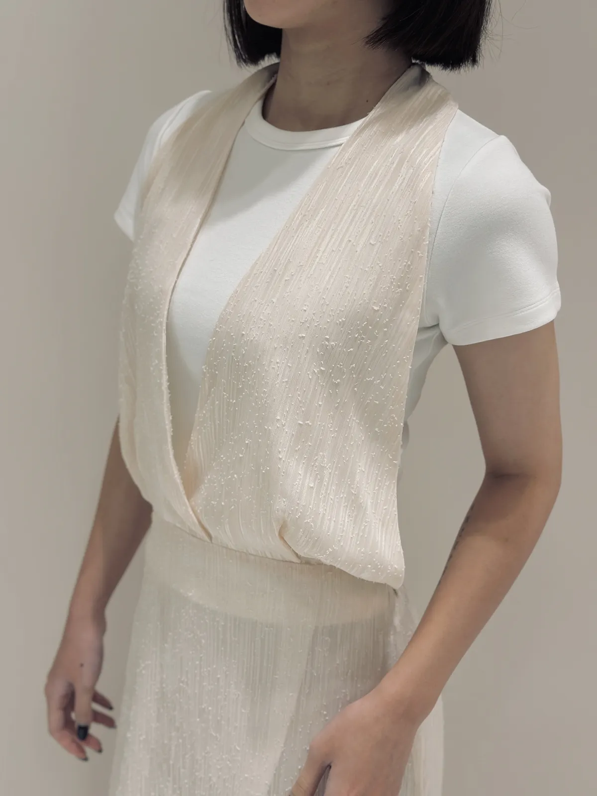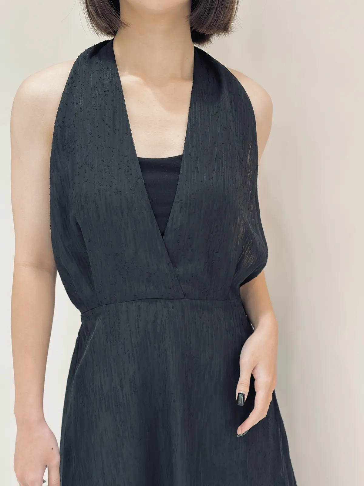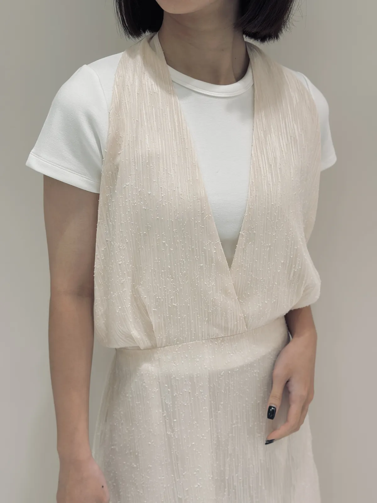 | 細節 | 雪紡V領繞脖腰部鬆緊綁帶設計 |