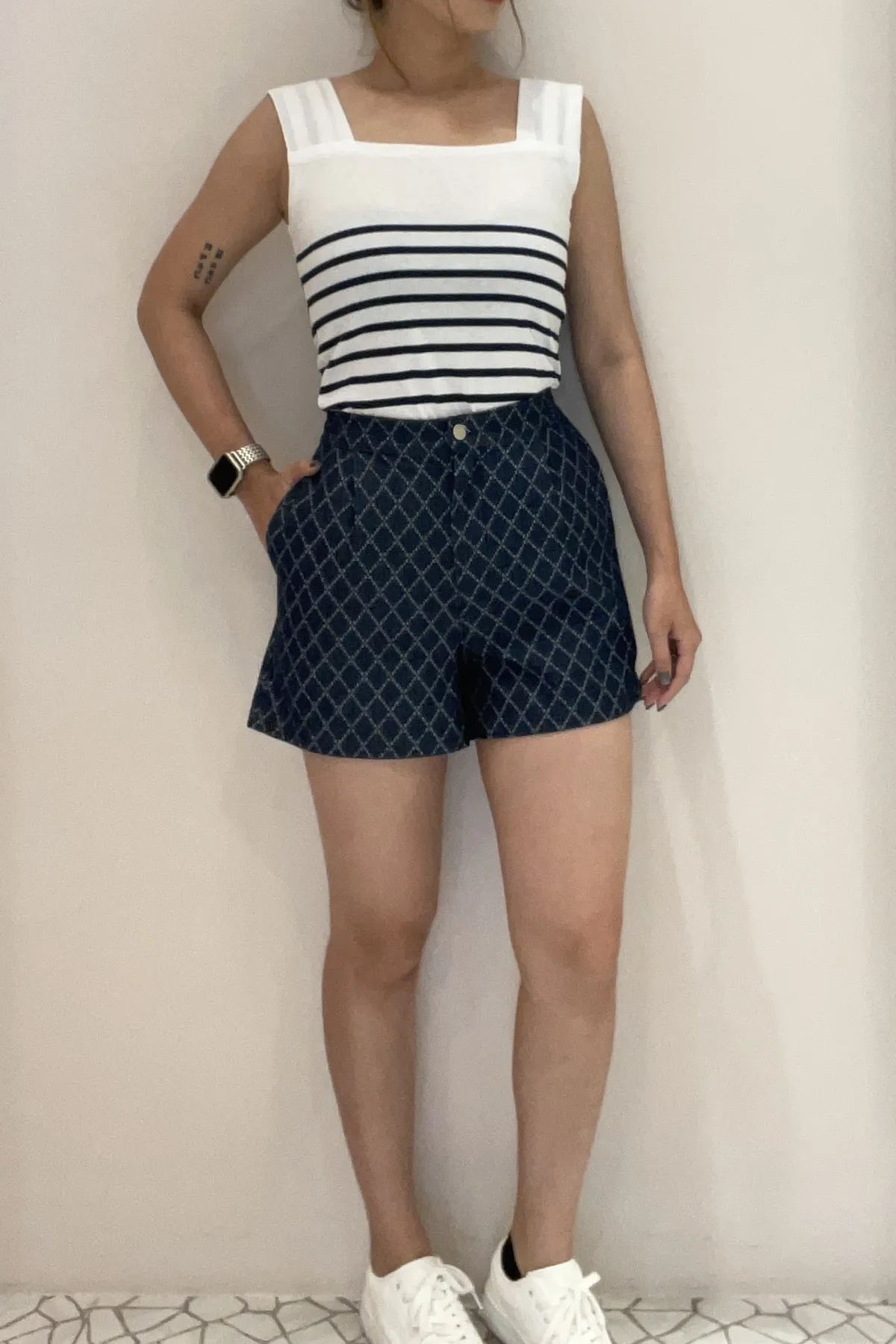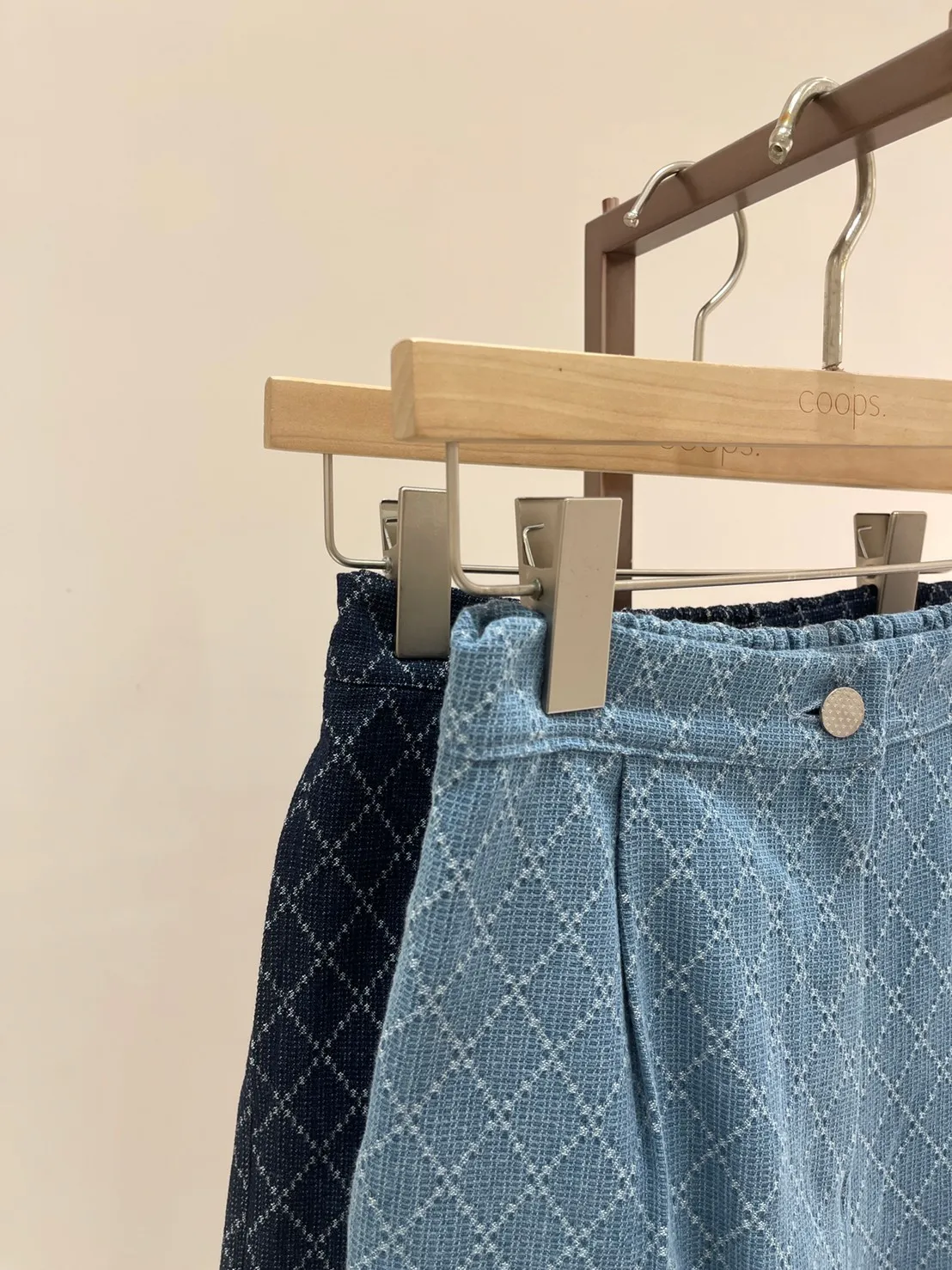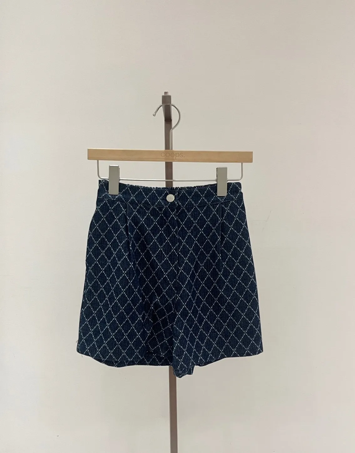 細節:挺版牛仔質感/收小腹打折設計/微A字下擺/菱格紋特別細節