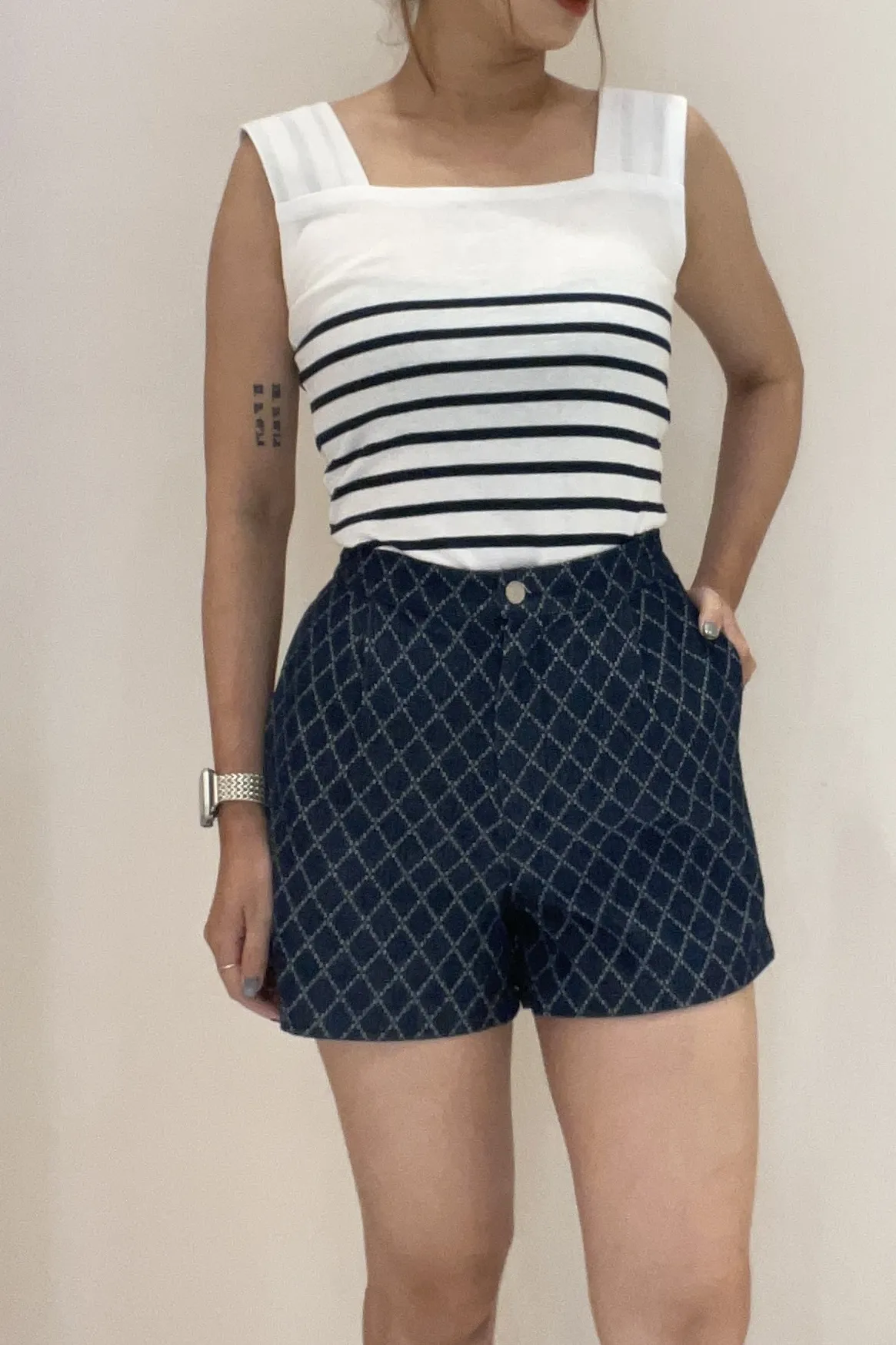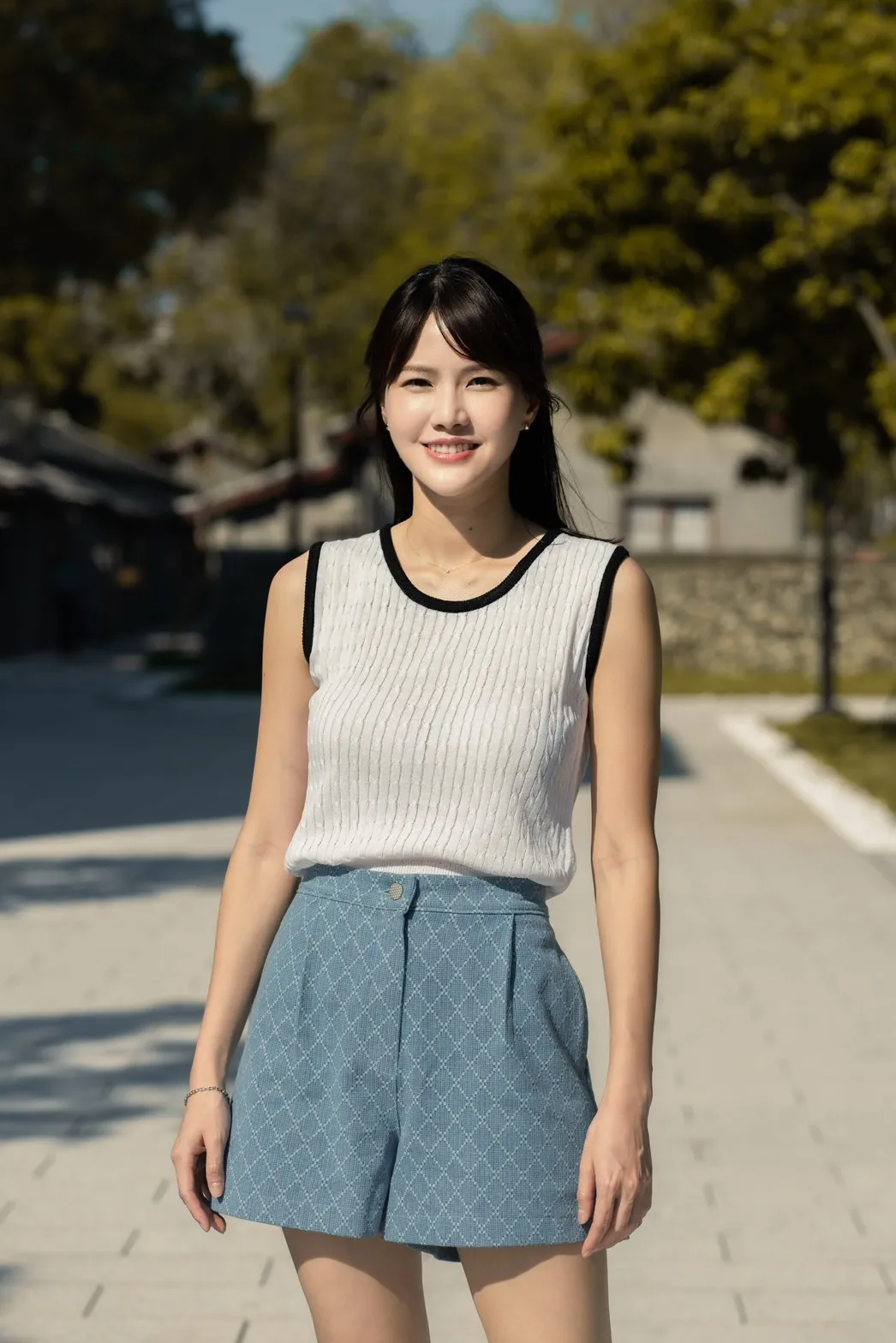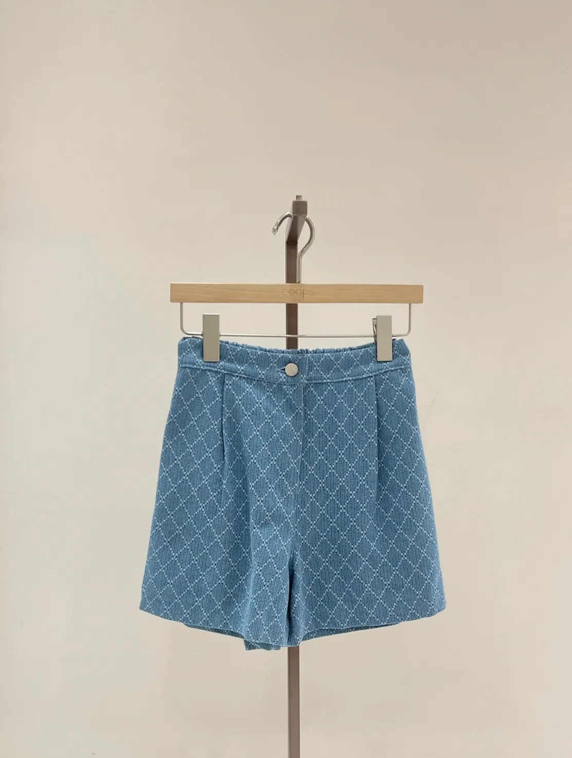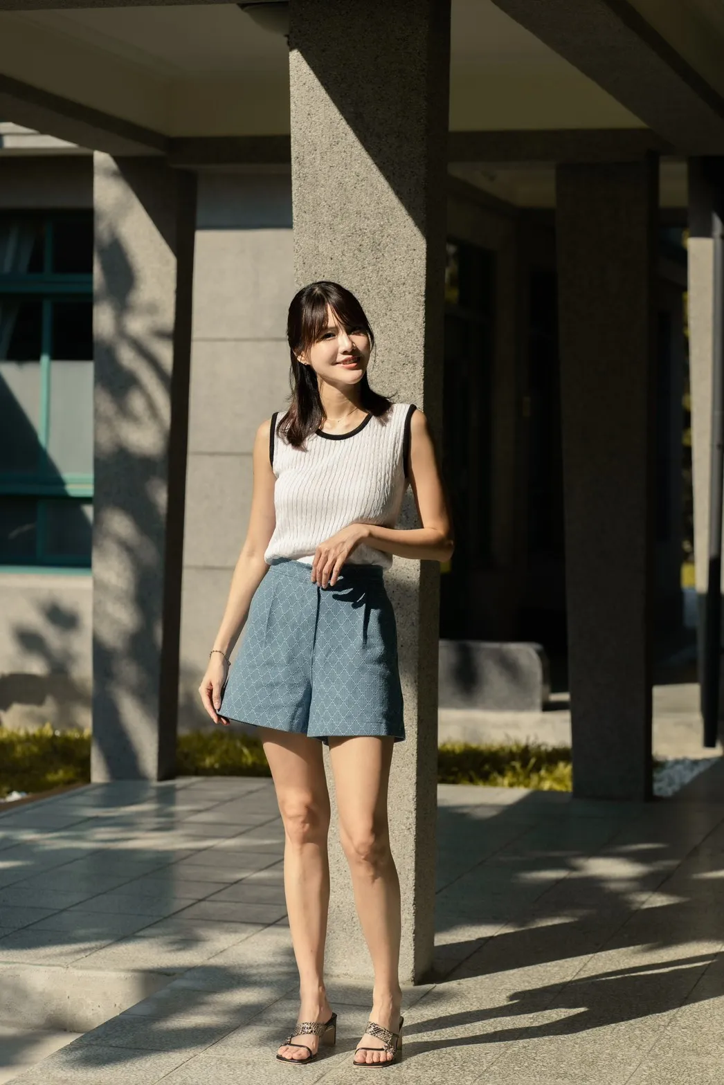 細節:挺版牛仔質感/收小腹打折設計/微A字下擺/菱格紋特別細節