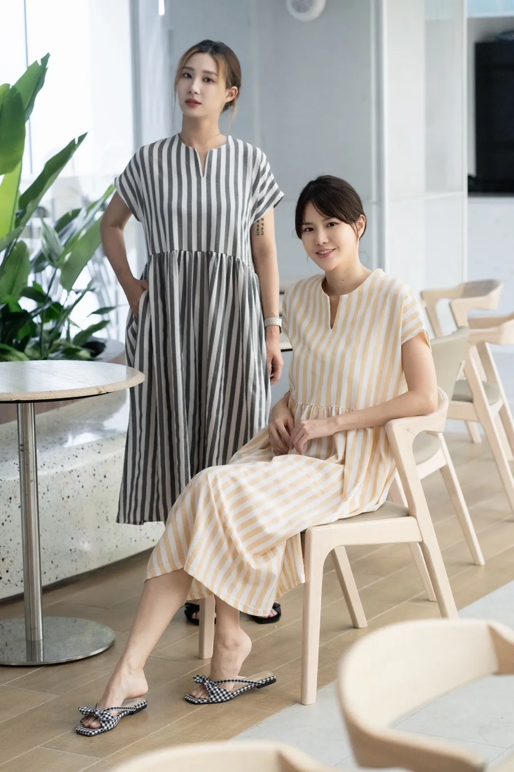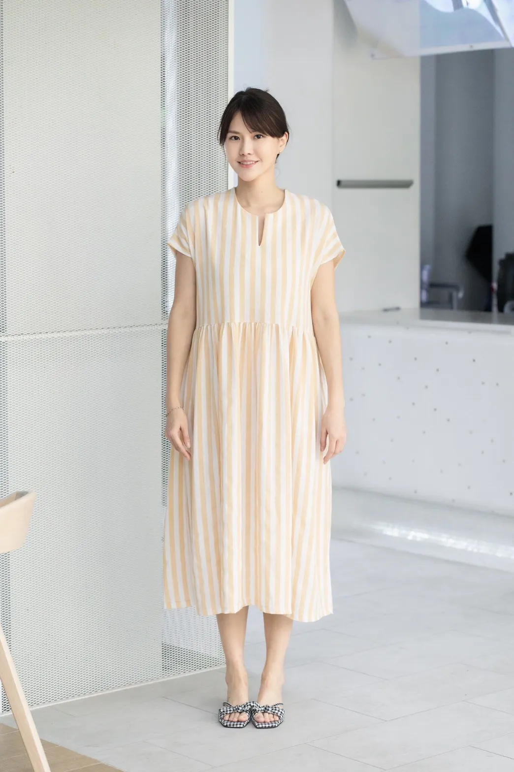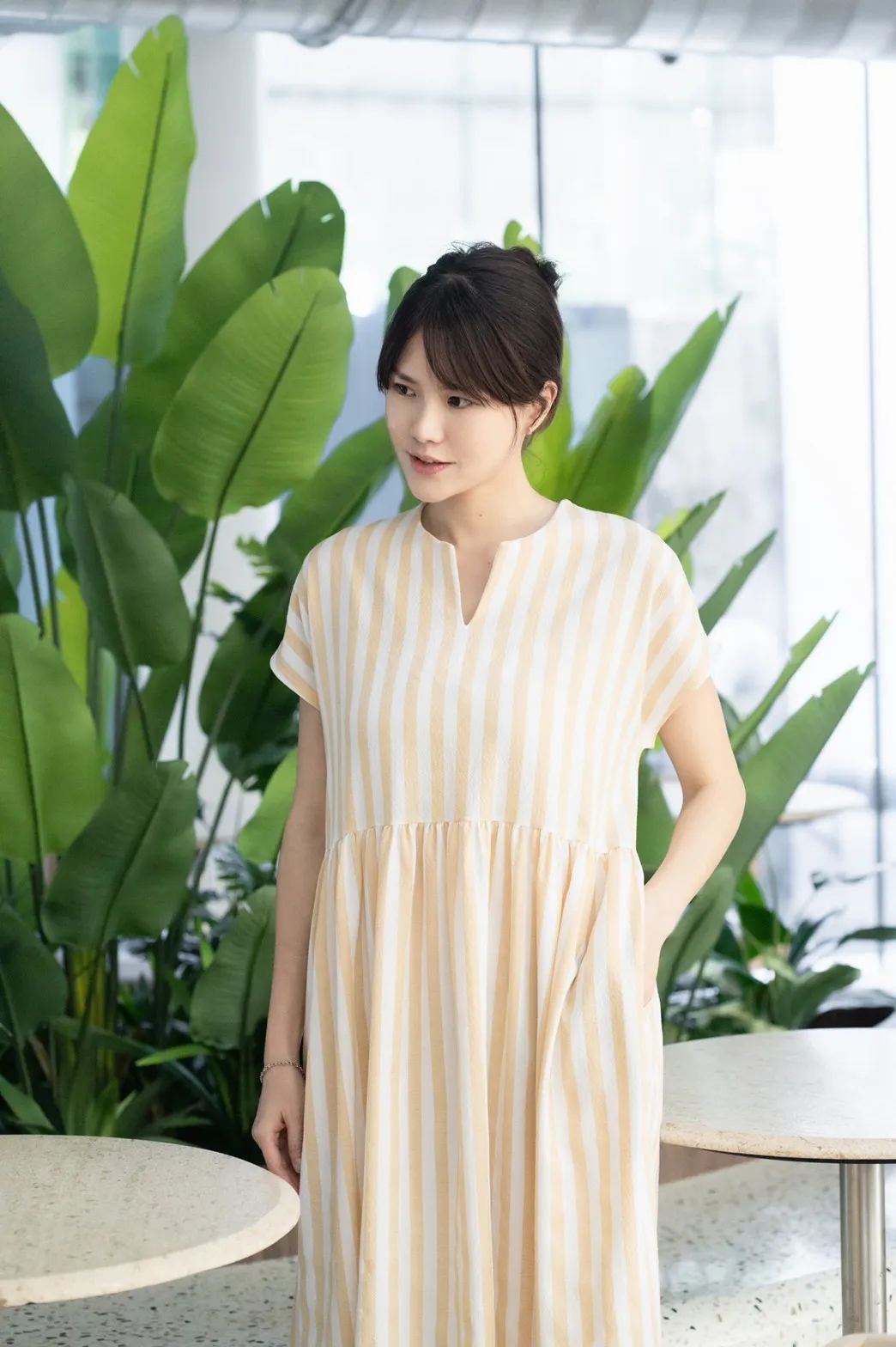 細節:前小v領設計/條紋修飾身形/下擺微傘擺顯質感