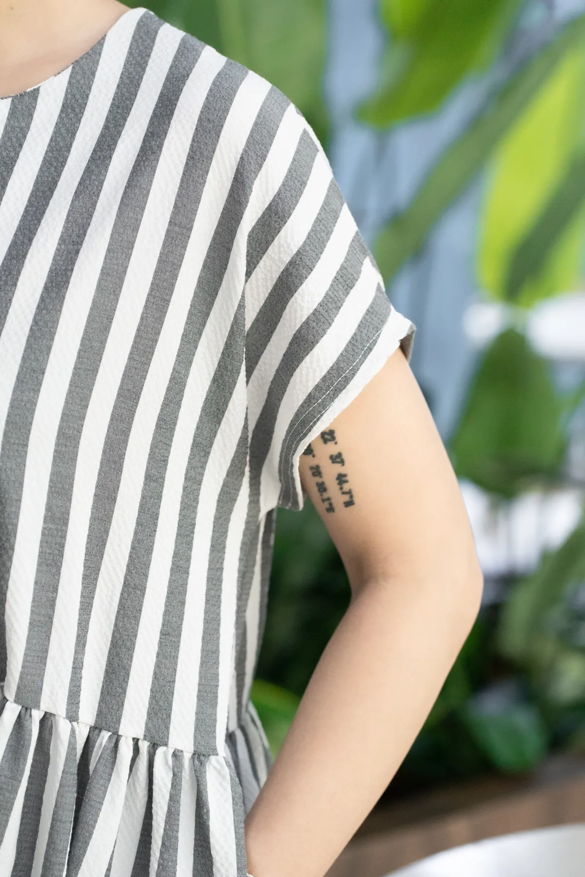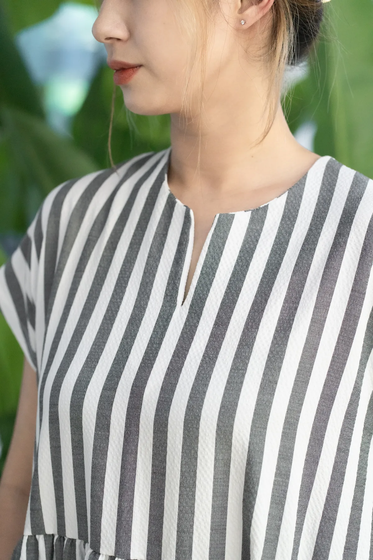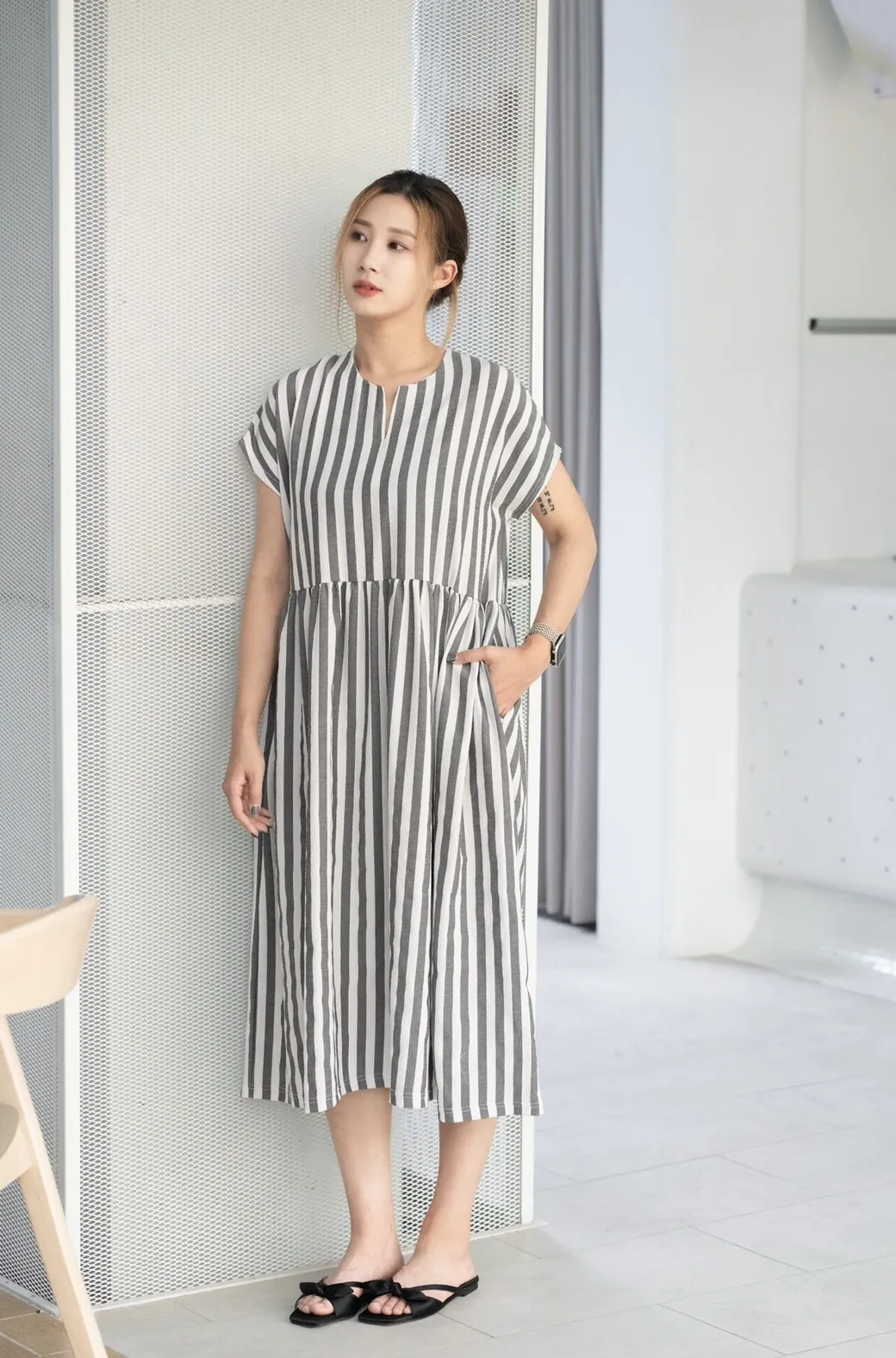 細節:前小v領設計/條紋修飾身形/下擺微傘擺顯質感