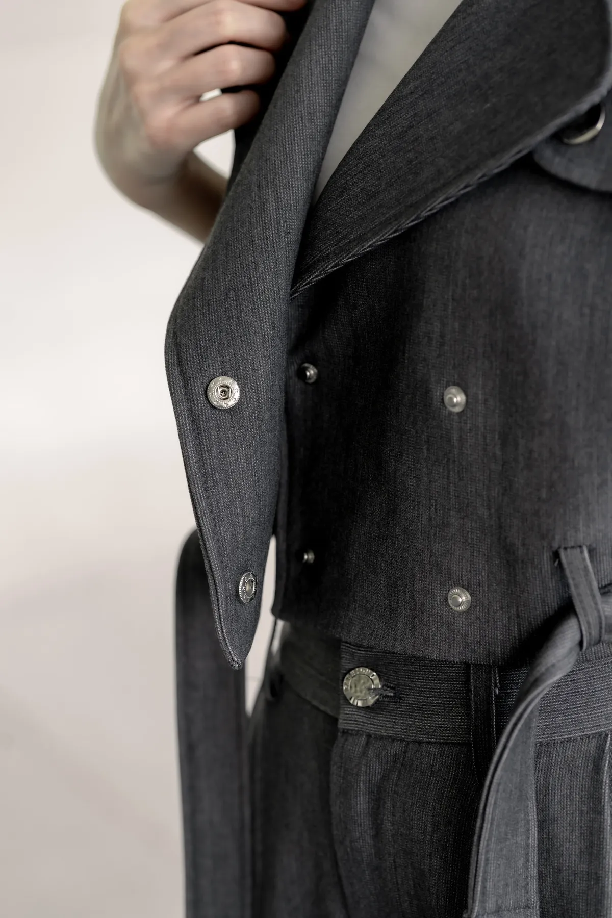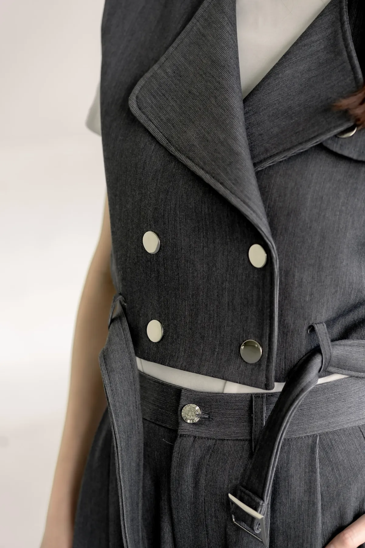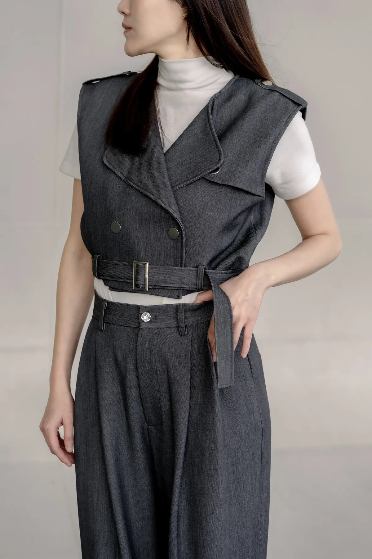 細節:腰帶增添帥氣感/高級選色/腹部和肩膀都做有鈕扣設計